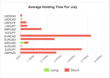 As a swing trader, I tend to hold my trades for a few days and a few weeks at maximum. The average holding time for my trades in July was 2-3 days (that's a rough estimate).
